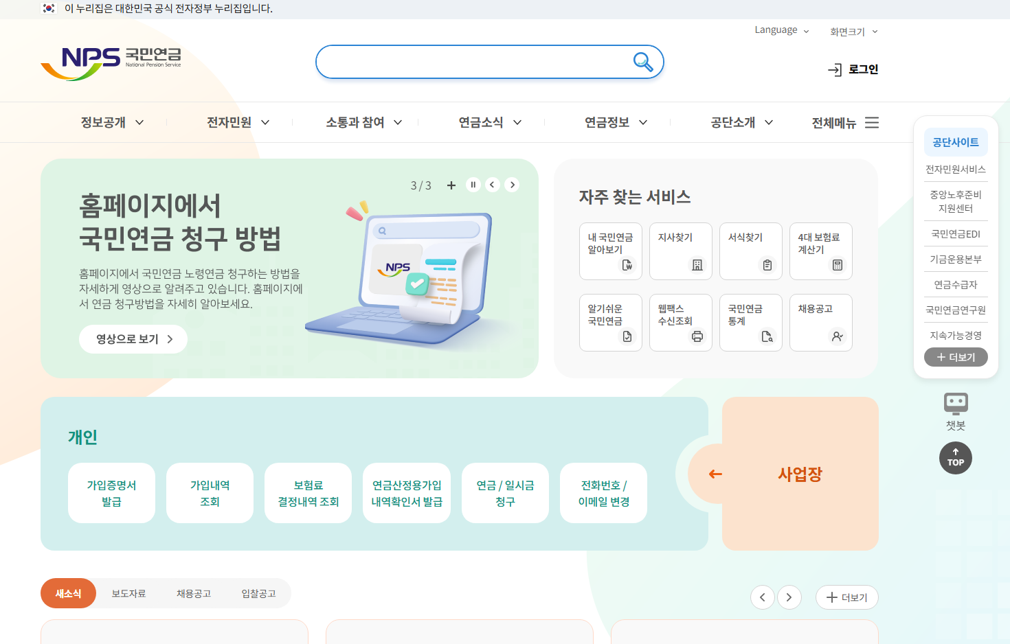 국민연금공단 홈페이지: https://www.nps.or.kr/jsppage/main.jsp
