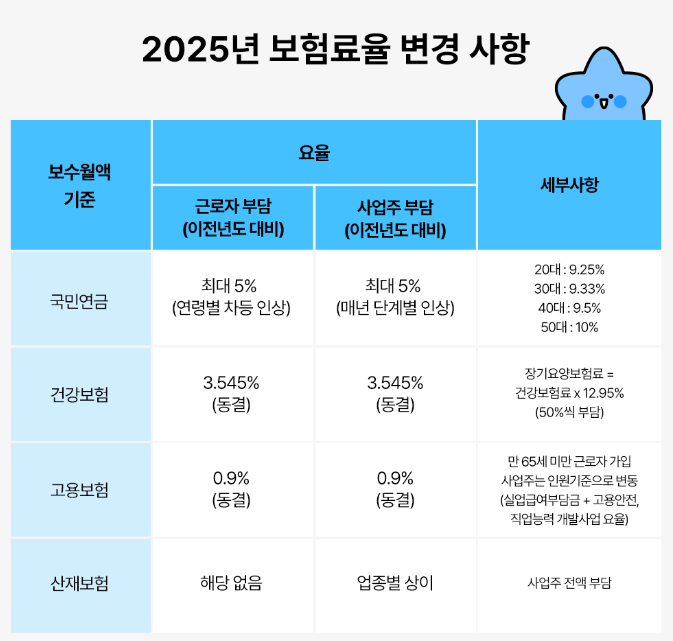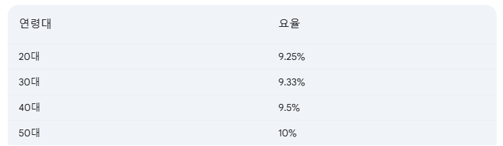 3. 연령대별 요율 인상: 50대의 경우 1%p 인상되어 10%가 적용되고(근로자와 사업주가 각각 5%씩 부담), 40대 이하도 연령대별로 0.25%p~0.5%p씩 인상되었습니다.