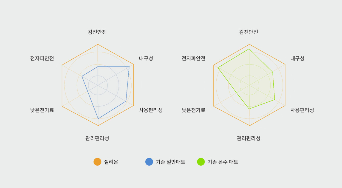 기존의 열선 매트와 달리 탄소 섬유를 사용하여 열을 발생시키기 때문에 전자파 노출을 최소화하고, 넓고 고른 온도 분포를 제공하는 것이 특징입니다.