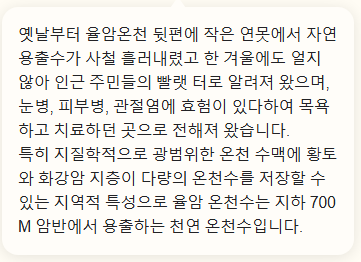 3. 부드러운 온천수: 율암온천의 온천수는 피부에 자극이 적고 부드러워 피로 회복에 도움을 줍니다.
