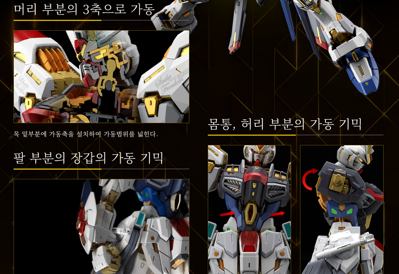 기존의 MG 시리즈를 뛰어넘는 압도적인 디테일과 가동성, 그리고 금속 재질을 활용한 고급스러운 외형으로 건프라 팬들에게 큰 사랑을 받고 있습니다.