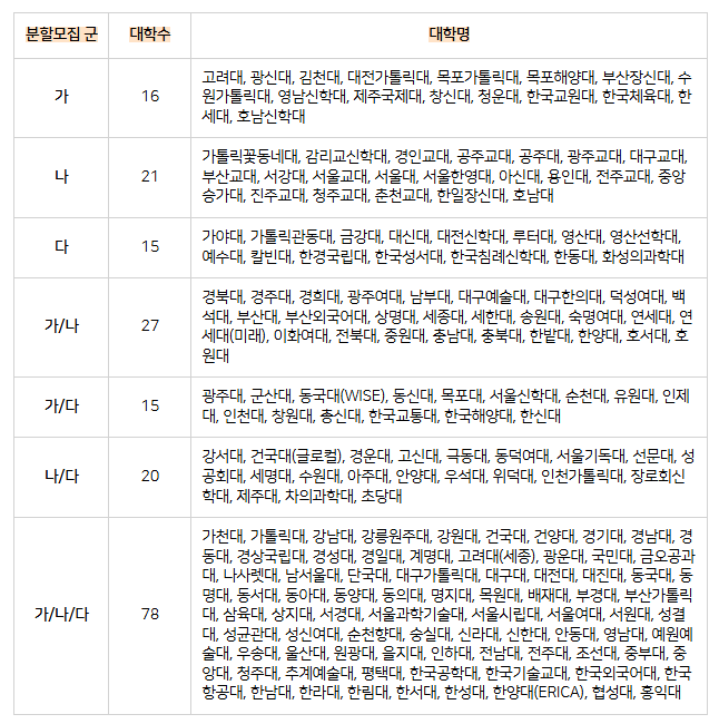 2. 나군: 중위권 대학들이 주로 배치되어 있으며, 교대, 사범대 등 특수 학과들이 많습니다.