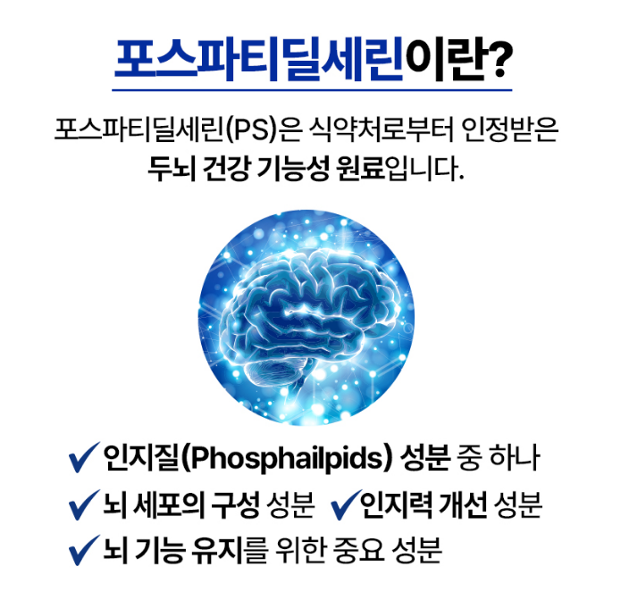 포스파티딜세린은 뇌 세포막의 주요 구성 성분으로, 뇌 기능 개선에 도움을 줄 수 있다고 알려져 있습니다.