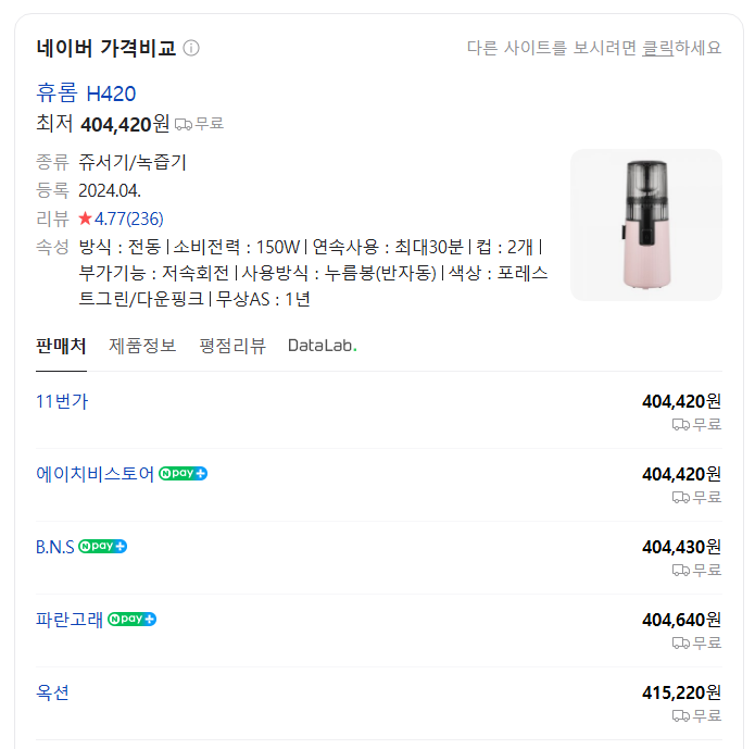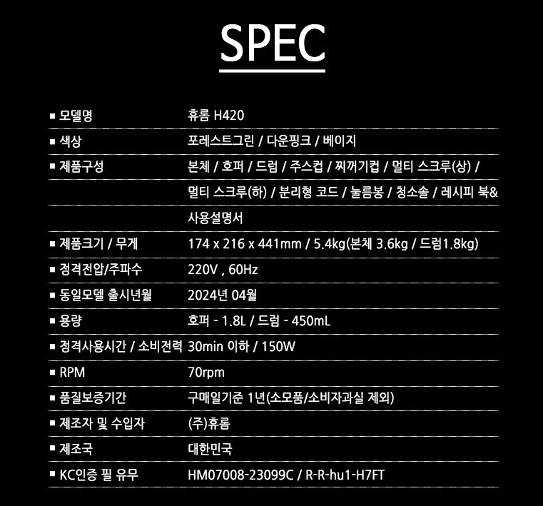 휴롬 H420은 최근 출시된 휴롬 착즙기의 최신 모델로, 기존 모델들의 장점을 모두 담아 한층 업그레이드된 성능과 디자인을 자랑합니다.