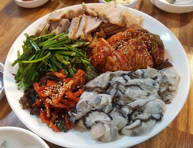3. 굴 보쌈: 쫄깃한 돼지고기 보쌈과 싱싱한 굴을 함께 먹는 환상적인 조합입니다.