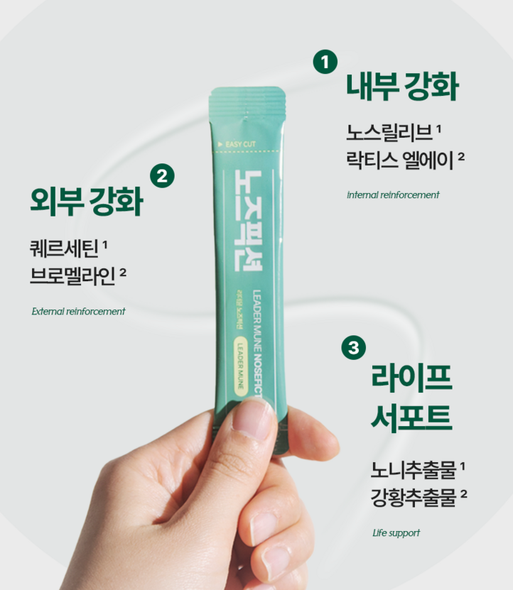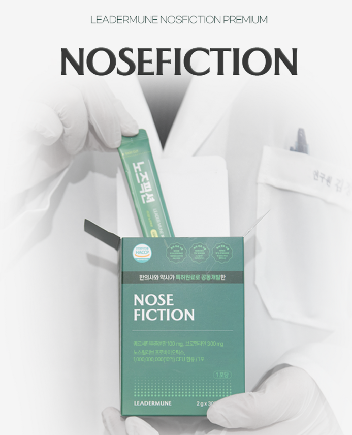 리더뮨 노즈픽션은 코 건강을 위한 건강기능식품이지만, 질병 치료 목적으로 사용될 수 없습니다.