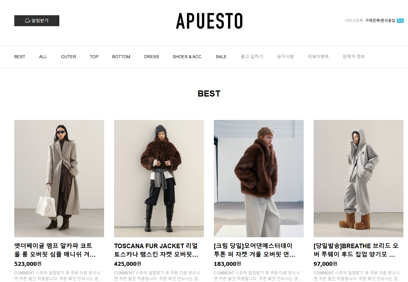 아포에스토(Apuesto)에 대해 알아볼까요?아포에스토 공식 홈페이지: https://apuesto.co.kr/아포에스토 인스타그램: @apuesto_official **아포에스토(Apuesto)**는 트렌디하고 감각적인 여성 의류를 선보
