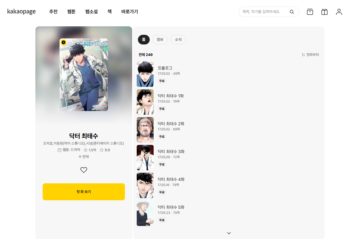 닥터 최태수는 조석호 작가의 판타지 의학 소설로, 카카오페이지에서 큰 인기를 얻으며 웹툰으로도 제작된 작품입니다.