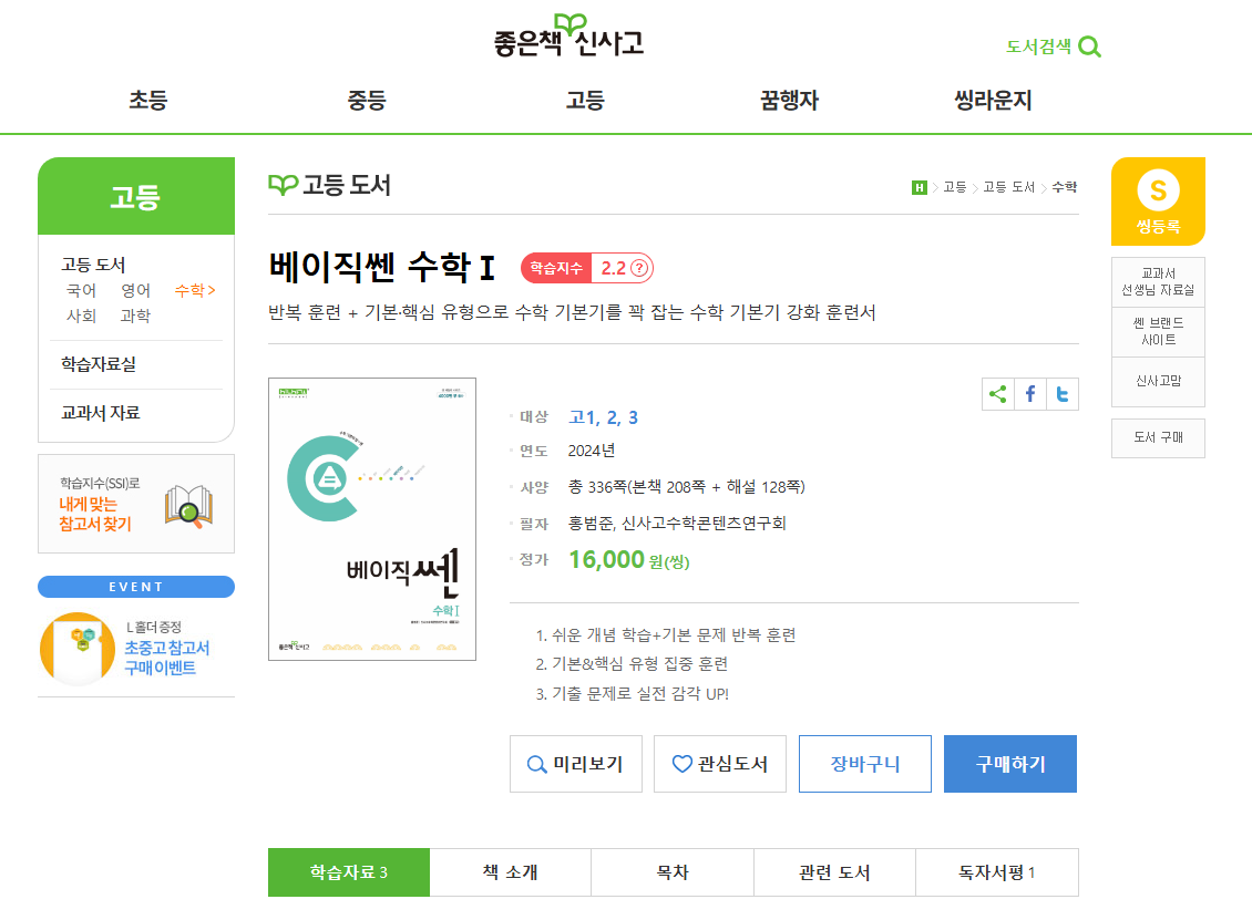 좋은책신사고 베이직쎈 수1, 수학 기본기를 다지는 완벽한 파트너!, 답지 다운로드하기.