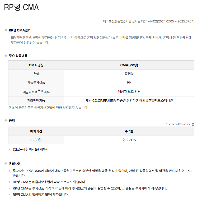 CMARP는 증권사에서 판매하는 CMA(Cash Management Account)의 한 종류로, RP(Repurchase Agreement, 환매조건부채권)에 투자하는 상품입니다. 본문
