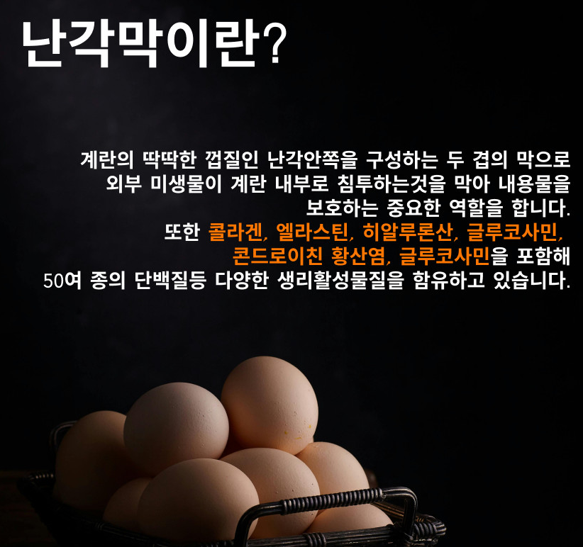 난각막가수분해물은 계란 껍데기 안쪽의 얇은 막을 가수분해하여 얻은 성분으로, 관절 건강에 도움을 줄 수 있다고 알려져 있습니다. 본문