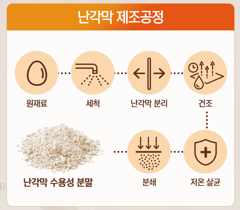 - 난각막가수분해물 제품은 건강기능식품으로, 의약품이 아니므로 질병의 예방 및 치료 목적으로 사용할 수 없습니다.