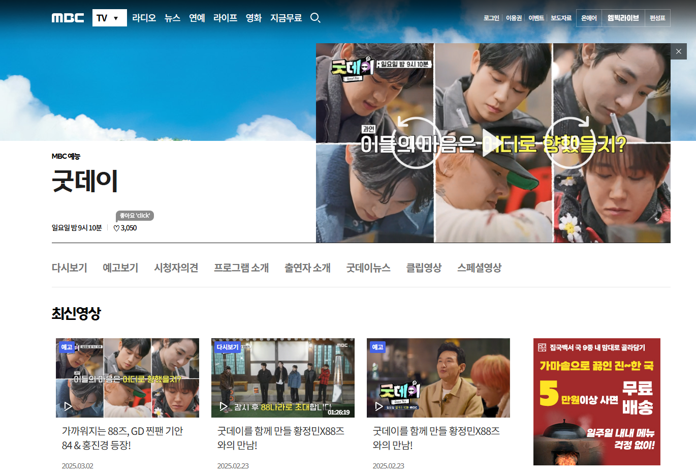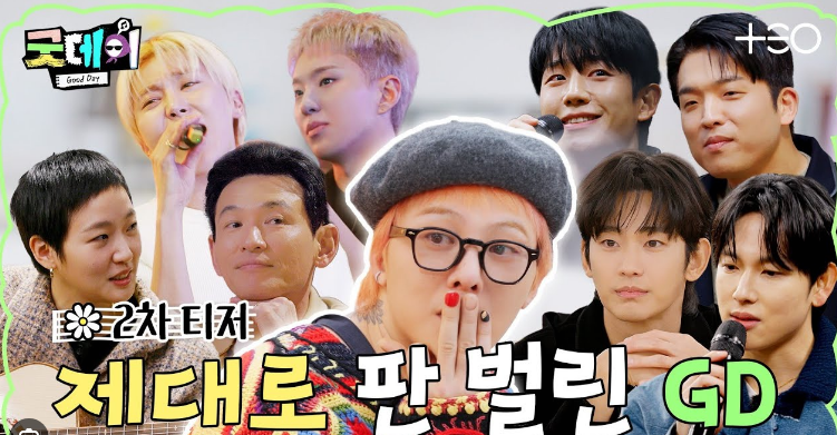 지드래곤이 출연하는 MBC 예능 프로그램 '굿데이'는 지드래곤이 다양한 분야의 사람들과 함께 한 해를 기록할 노래를 만드는 음악 프로젝트로, 2025년 2월 16일부터 매주 일요일 밤 9시 10분에 방송되고 있습니다.